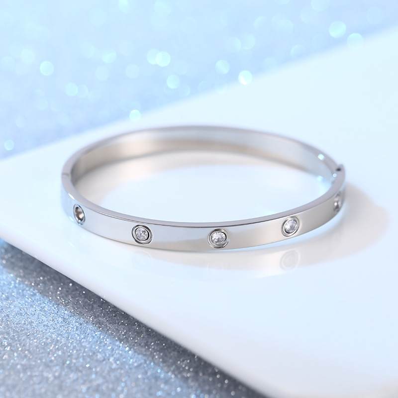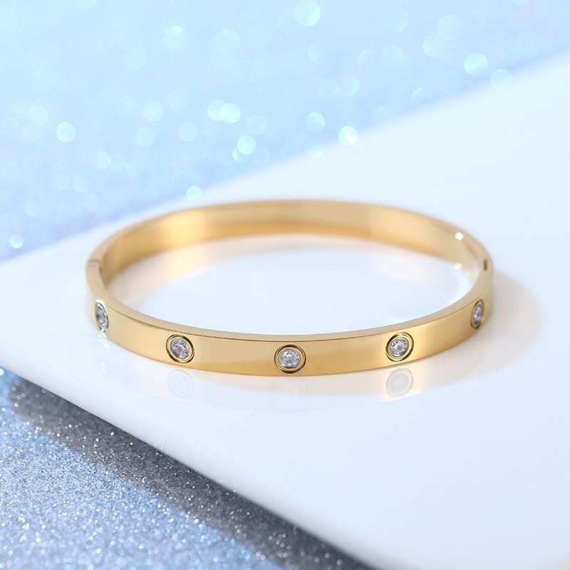 The bracelet is made from stainless steel, 18k gold plated and zircon stones. The material is highly durable, you can wear it every day anywhere without the risk of getting it damaged or color change. The material has a brilliant shine to it. You can style it with any everyday wear.